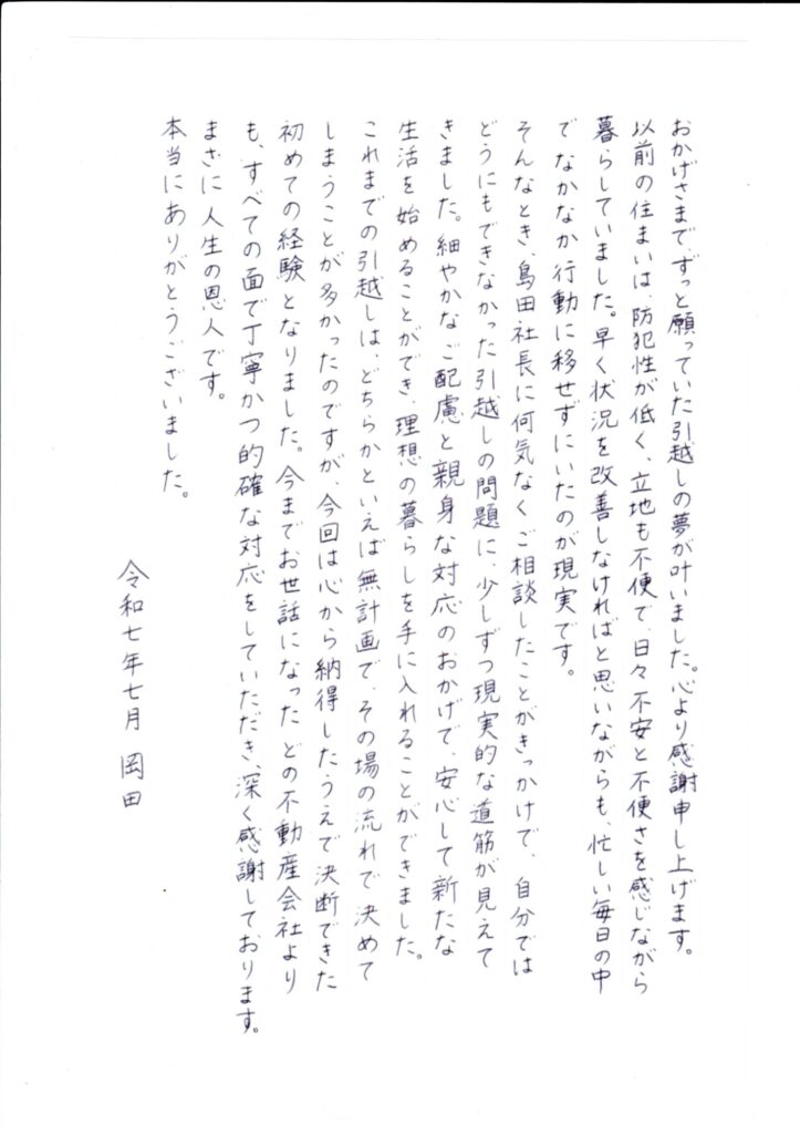 この度はN.H様の大切なマイホーム探しを当社にお任せ下さり、誠にありがとうございました。